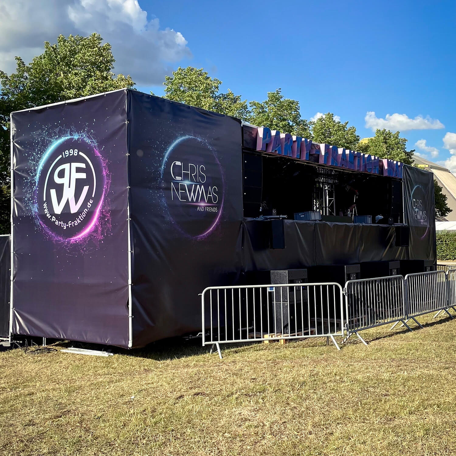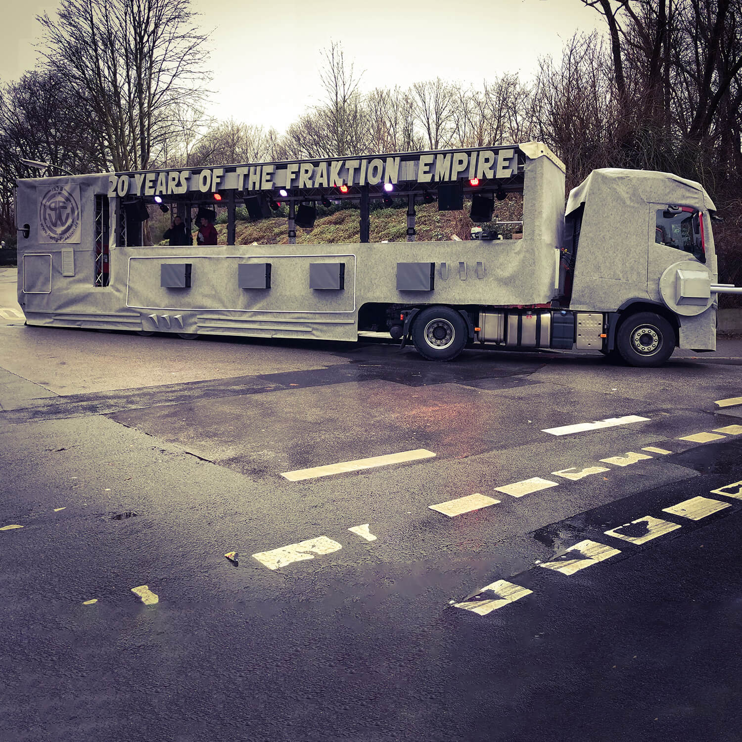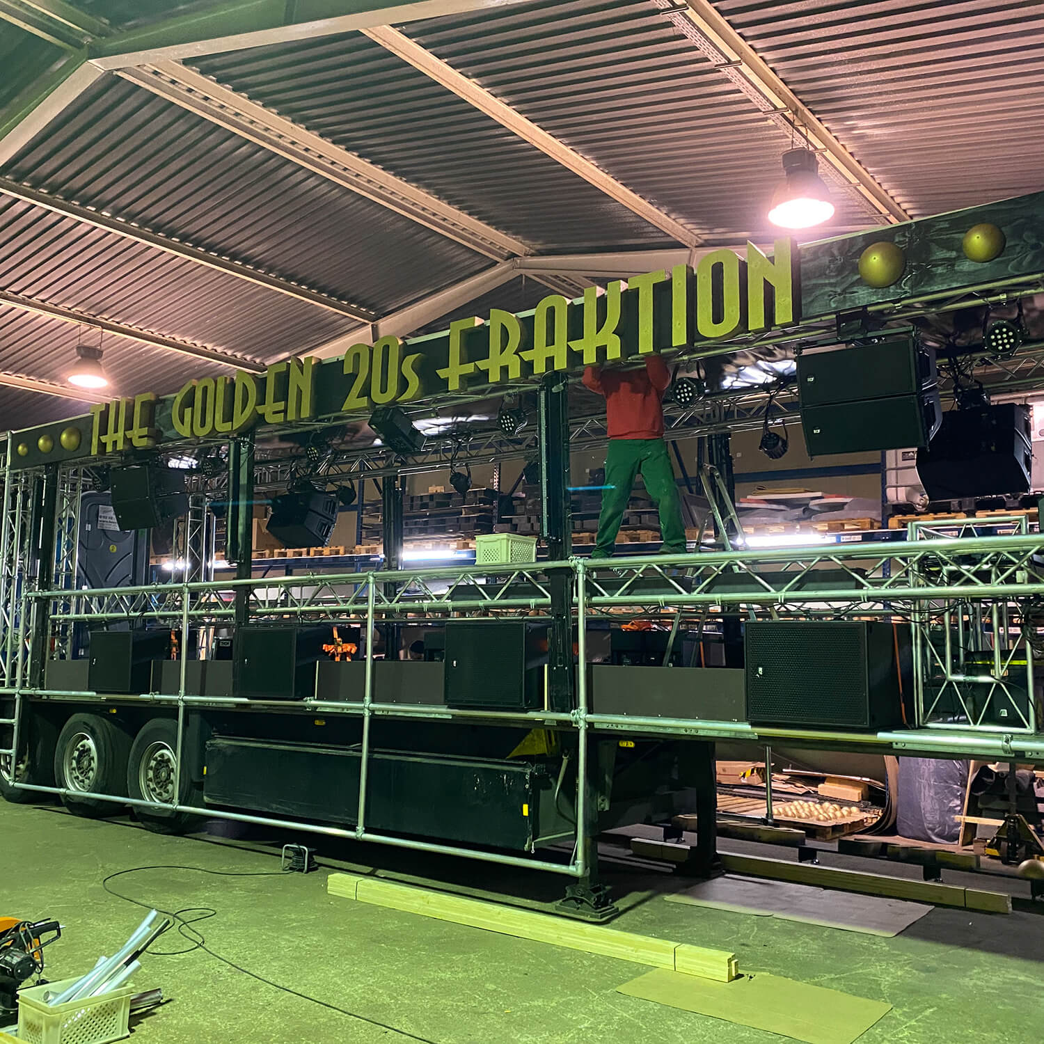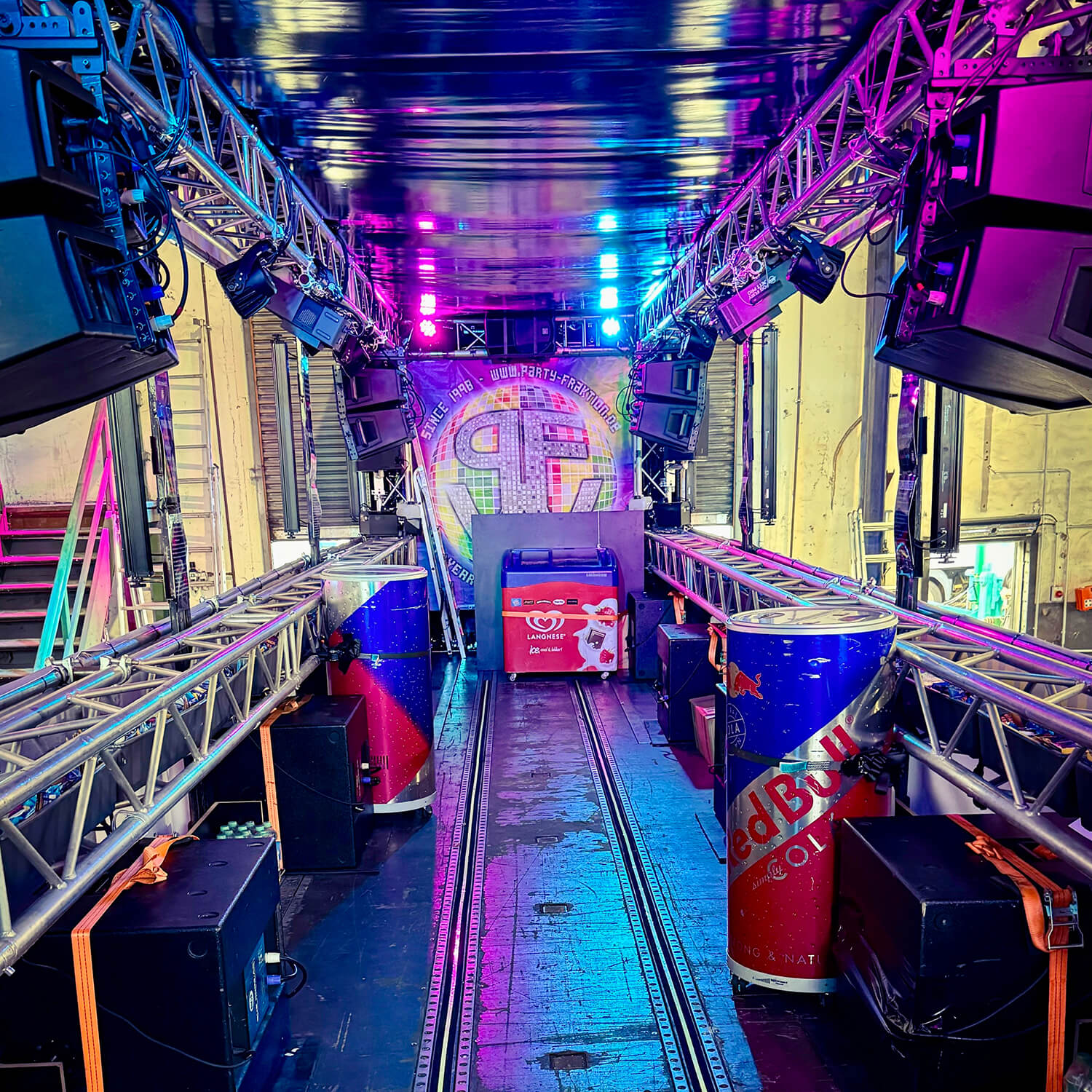 Ursprünglich für den Transport gedacht, haben wir den Auflieger zu einer beeindruckenden mobilen Bühne umgestaltet. Er bietet eine flexible Plattform für verschiedene Events – ob Technoparaden, Umzüge oder als feststehende Stage auf Festivals. Mit seiner imposanten Präsenz und Vielseitigkeit verwandelt er jede Veranstaltung in ein unvergessliches Erlebnis.